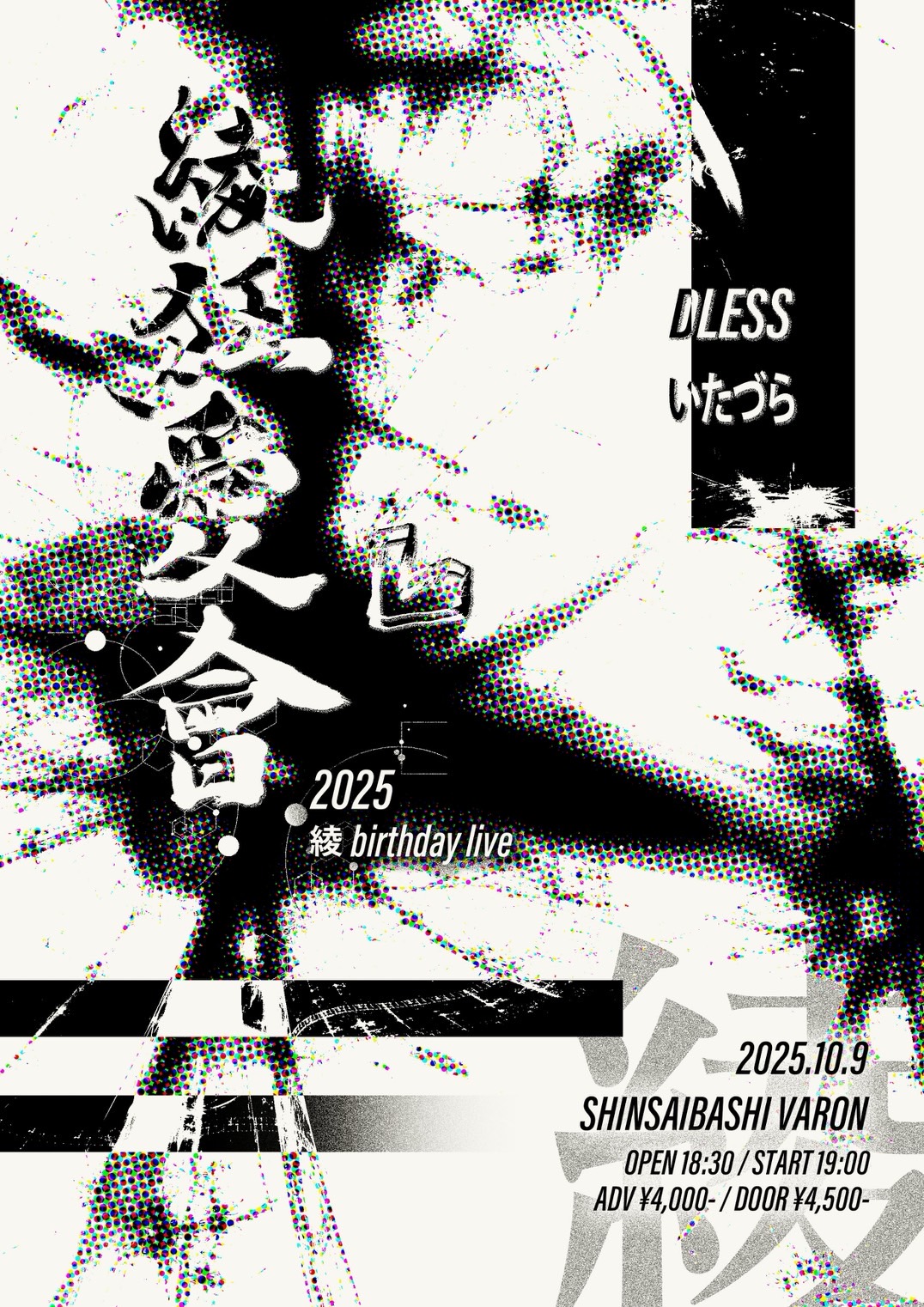 心斎橋 VARON(ヴァロン) スケジュール 2025.10.09(Thu) いたづら×SHINSAIBASHI VARON pre. 綾 Birthday Live「綾狂愛會」 [ACT] いたづら / DLESS [OPEN/START] 18:30/19:00 [料金] ADV/DOOR ¥4,000- / ¥4,500- (+1D¥700) (問)心斎橋VARON 06-6243-1400 / info@osaka-varon.jp チケット予約 →https://tiget.net/events/427051