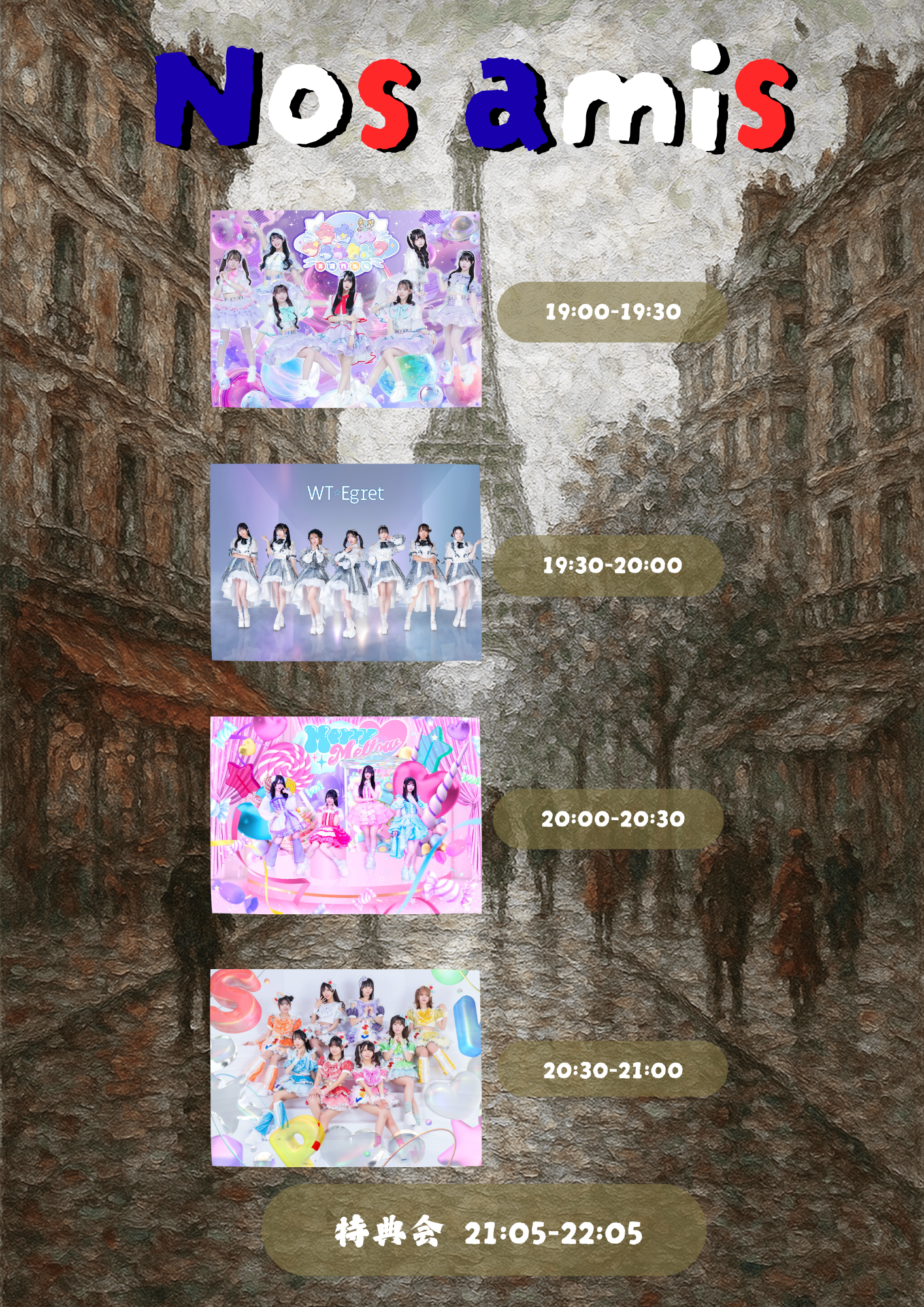 心斎橋 VARON(ヴァロン) スケジュール 2025.11.18(Tue) Nos amis [ACT] すーぱーぷーばぁー!! / WT☆Egret / 宇宙∞プラネクシア / Merry Mellow [OPEN/START] 18:30/19:00 [料金] ⼀般¥2,500(事前⽀払)+1D / ⼀般¥3,000+1D (問)心斎橋VARON 06-6243-1400 / info@osaka-varon.jp