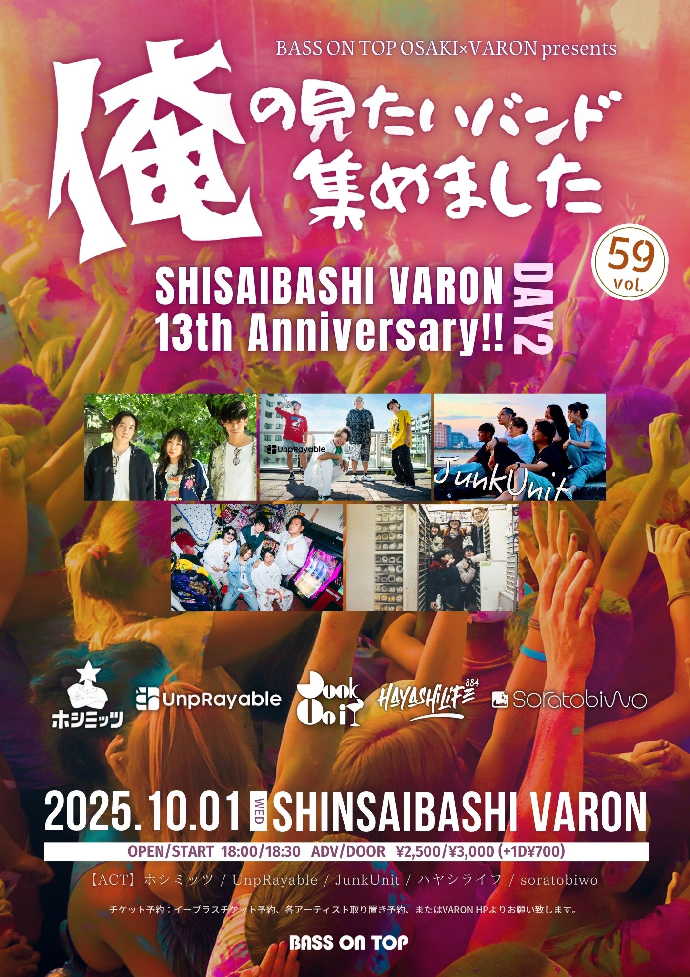 心斎橋 VARON(ヴァロン) スケジュール 2025.10.01(Wed) SHISANSAIBASHI VARON × BASSONTOP OSAKI pre. 俺の見たいバンド集めました vol.59 SHISANIBASHI VARON13th ANNIVERSARY!! [ACT] ホシミッツ / UnpRayable / JunkUnit / ハヤシライフ / soratobiwo [OPEN/START] 18:00/18:30 [料金] ¥2,500 / ¥3,000 (+1D¥700) (問)心斎橋VARON 06-6243-1400 / info@osaka-varon.jp
