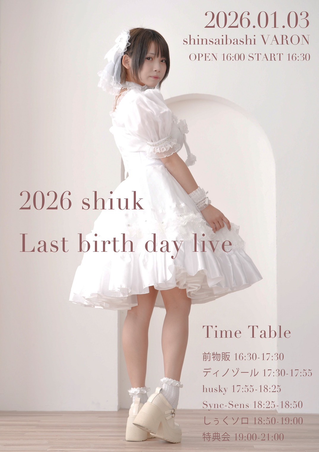 心斎橋 VARON(ヴァロン) スケジュール 2026.1.03(Sat) 2026 shiuk birth day live [ACT] husky / ディノゾール / Sync-Sens [OPEN/START] 16:00/16:30 [料金] 前売:¥2,800 当日:¥3,300 (1D別) (問)心斎橋VARON 06-6243-1400 / info@osaka-varon.jp 予約フォーム →https://tiget.net/events/442679