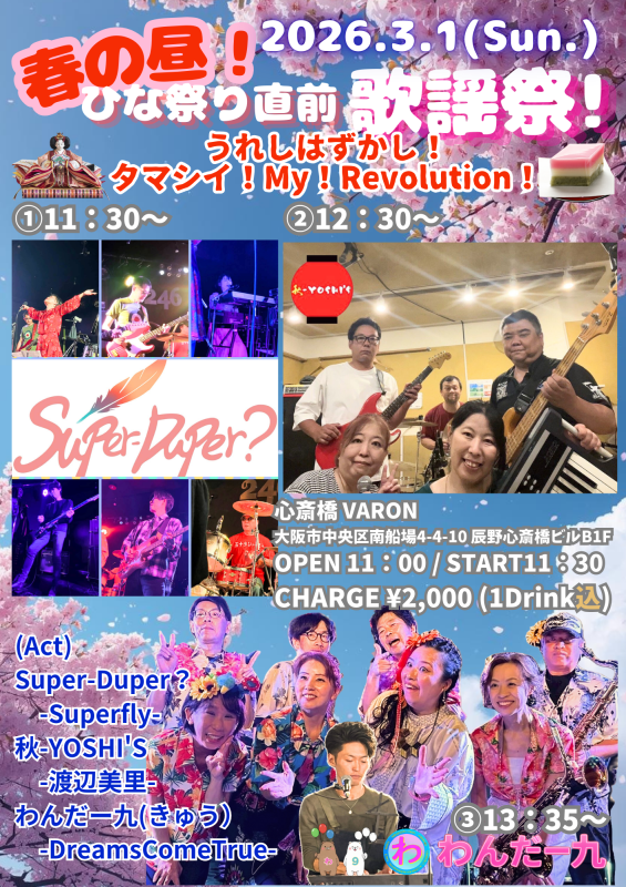 心斎橋 VARON(ヴァロン) スケジュール 2026.3.01(Sun) 春の昼!ひな祭り直前歌謡祭! ~うれしはずかし!タマシイ!My!Revolution!~ [ACT] Super-Duper?(Superfly cover) / 秋-YOSHI’s(渡辺美里 cover) / わんだー九(DREMS COME TRUE cover) [OPEN/START] 11:00/11:30 [料金] 2000円(1drink込み) (問)心斎橋VARON 06-6243-1400 / info@osaka-varon.jp