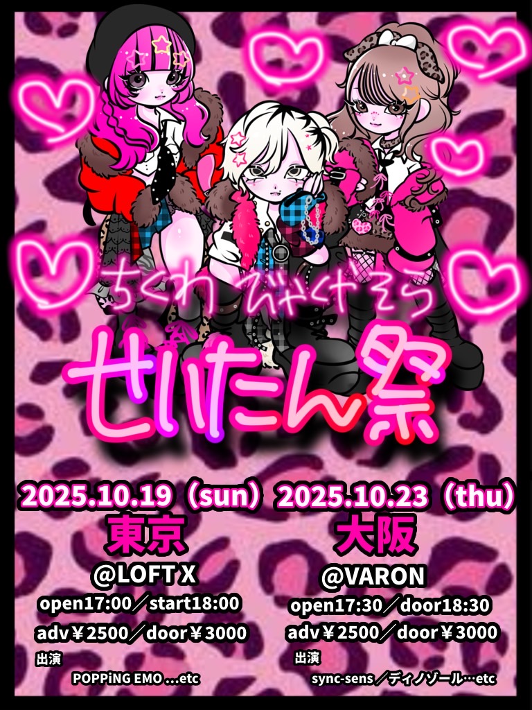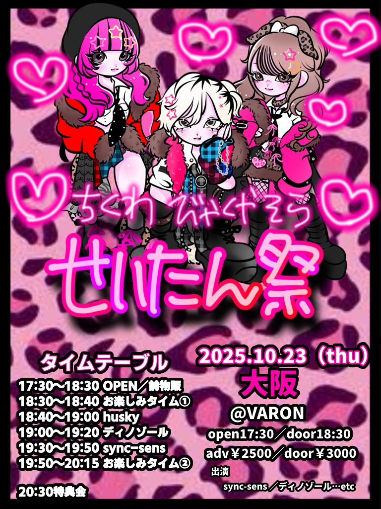 心斎橋 VARON(ヴァロン) スケジュール 2025.10.23(Thu) ちくわ・びゃくや・そら 生誕祭 大阪編 [ACT] husky / sync-sens / ディノゾール [OPEN/START] 17:30/18:30 [料金] ADV/DOOR ¥2500/¥3000(1D別) (問)心斎橋VARON 06-6243-1400 / info@osaka-varon.jp 予約フォーム →https://tiget.net/events/426328