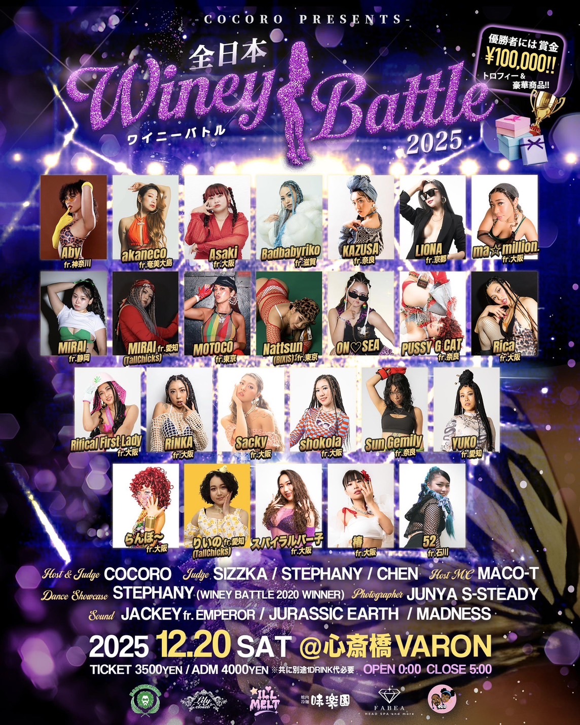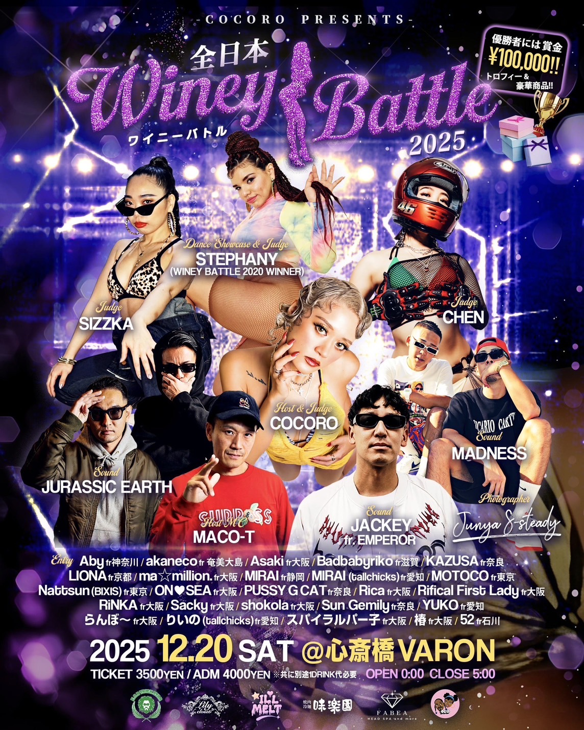 心斎橋 VARON(ヴァロン) スケジュール 2025.12.20(Sat) 全日本WINEY BATTLE 2025 [ACT] フライヤー参照ください。 [OPEN/START] OPEN 24:00 / CLOSE 5:00 [料金] TOCKET ¥3,500 / ADM ¥4,000 (1D別途必要) (問)心斎橋VARON 06-6243-1400 / info@osaka-varon.jp