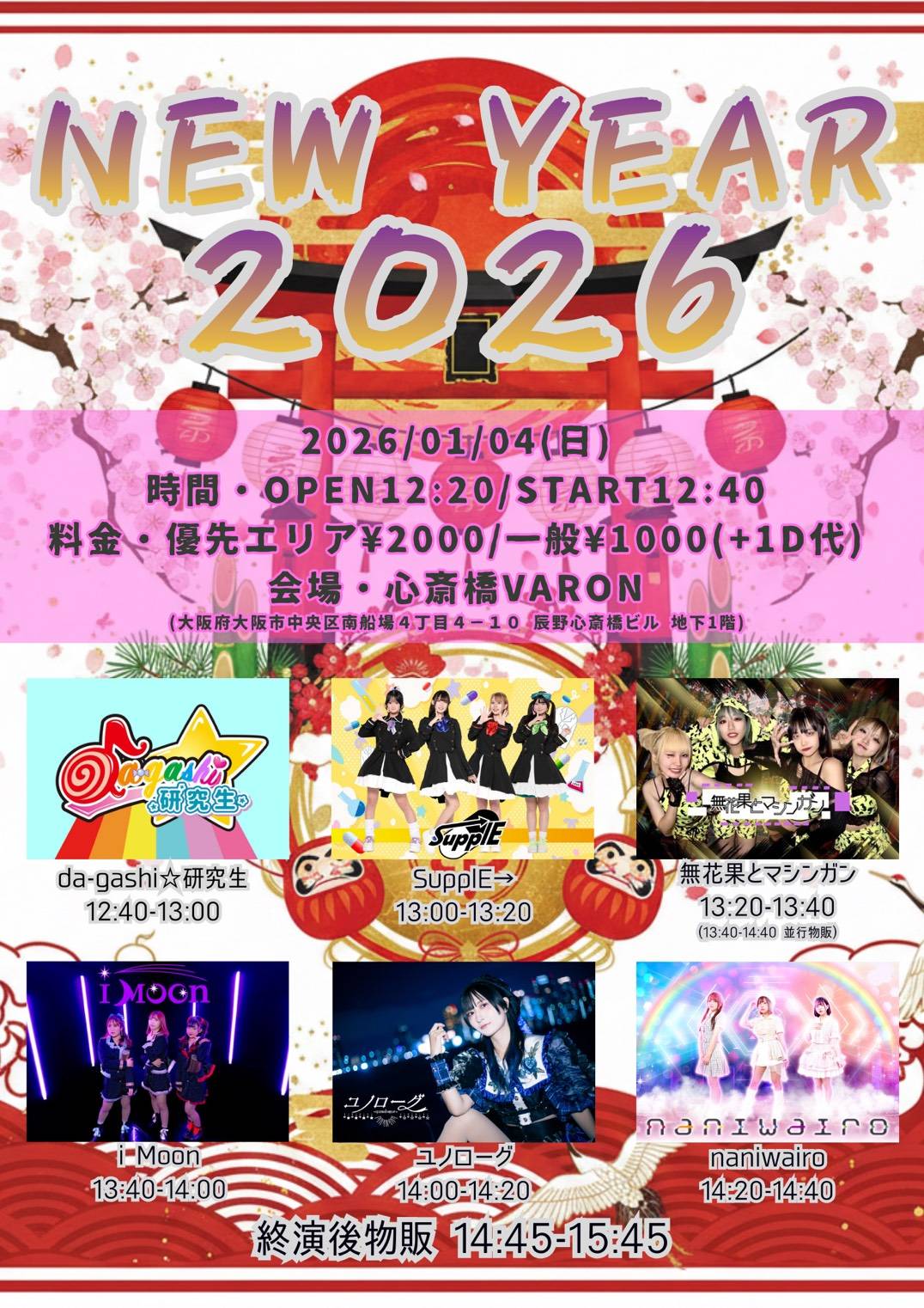 心斎橋 VARON(ヴァロン) スケジュール 2026.1.04(Sun) 『NEW YEAR 2026』 [ACT] da-gashi☆研修生 / SupplE→ / 無花果とマシンガン / i Moon / ユノローグ / naniwairo [OPEN/START] 12:20/12:40 [料金] 優先エリア¥2000(+1D) / 一般¥1000(+1D) (問)心斎橋VARON 06-6243-1400 / info@osaka-varon.jp チケット予約 https://tiget.net/events/455782