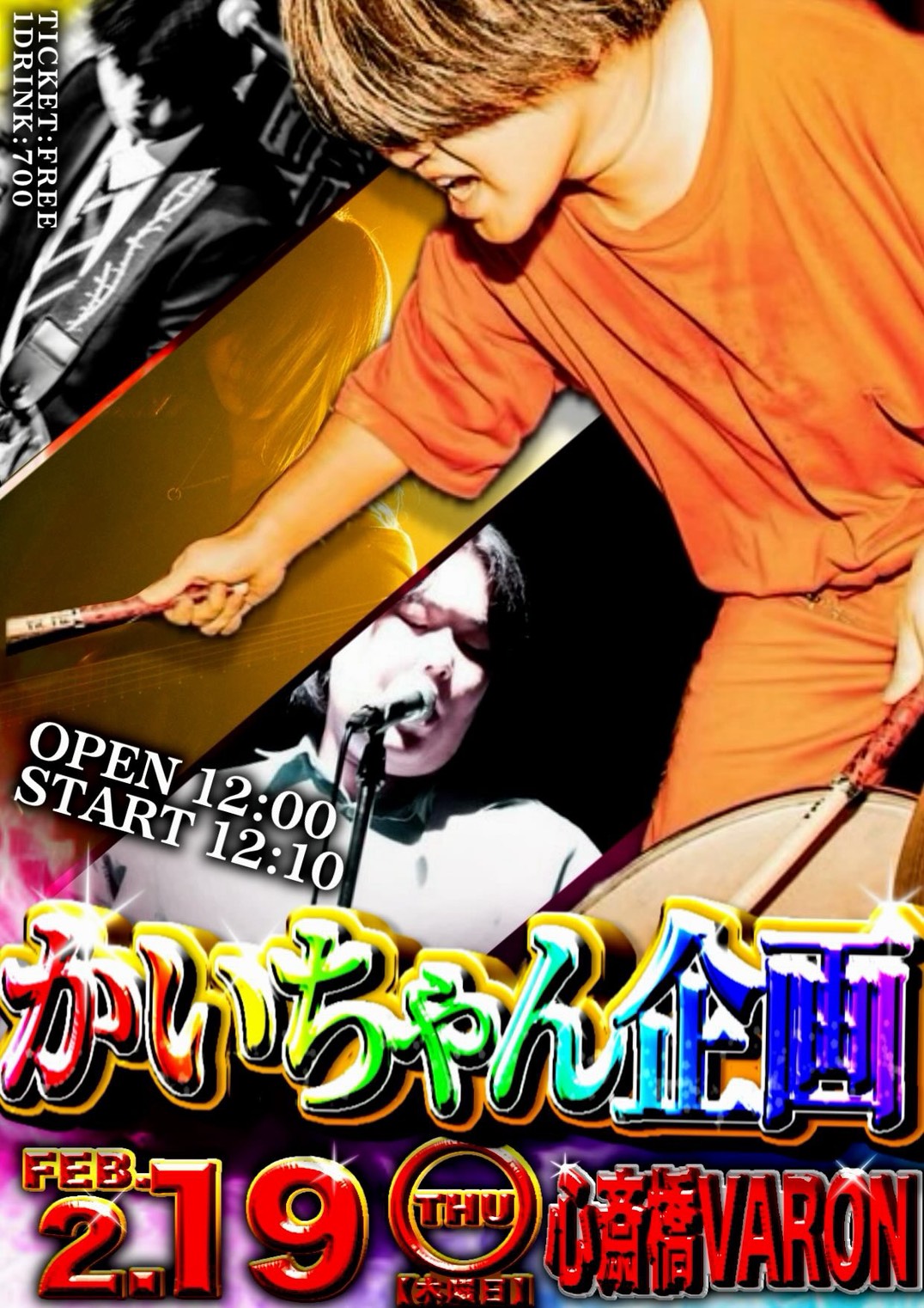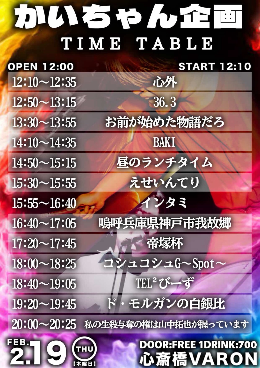 心斎橋 VARON(ヴァロン) スケジュール 2026.2.19(Thu) かいちゃん企画 [ACT] 心外 / 36.3 / 昼のランチタイム / BAKI / お前が始めた物語だろ / えせいんてり / 嗚呼兵庫県神戸市我故郷 / 帝塚杯 / コシュコシュG~Spot~ / TEL²びーず / ド・モルガンの白銀比 / 私の生殺与奪の権は山中拓也が握っています [OPEN/START] 12:00/12:10 [料金] FREE (+1D¥700) (問)心斎橋VARON 06-6243-1400 / info@osaka-varon.jp