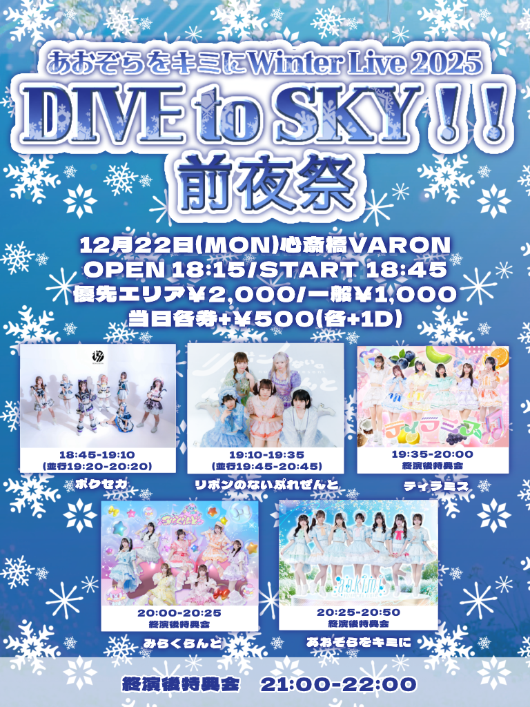 心斎橋 VARON(ヴァロン) スケジュール 2025.12.22(Mon) 『あおぞらをキミにWinter Live2025 〜DIVE to SKY!!〜前夜祭』 [ACT] あおぞらをキミに / みらくらんど / ティラミス / リボンのないぷれぜんと / ボクセカ [OPEN/START] 18:15/18:45 [料金] 優先¥2,000/一般¥1,000/当日各券+¥500(各+1D) (問)心斎橋VARON 06-6243-1400 / info@osaka-varon.jp チケット →https://tiget.net/events/451362