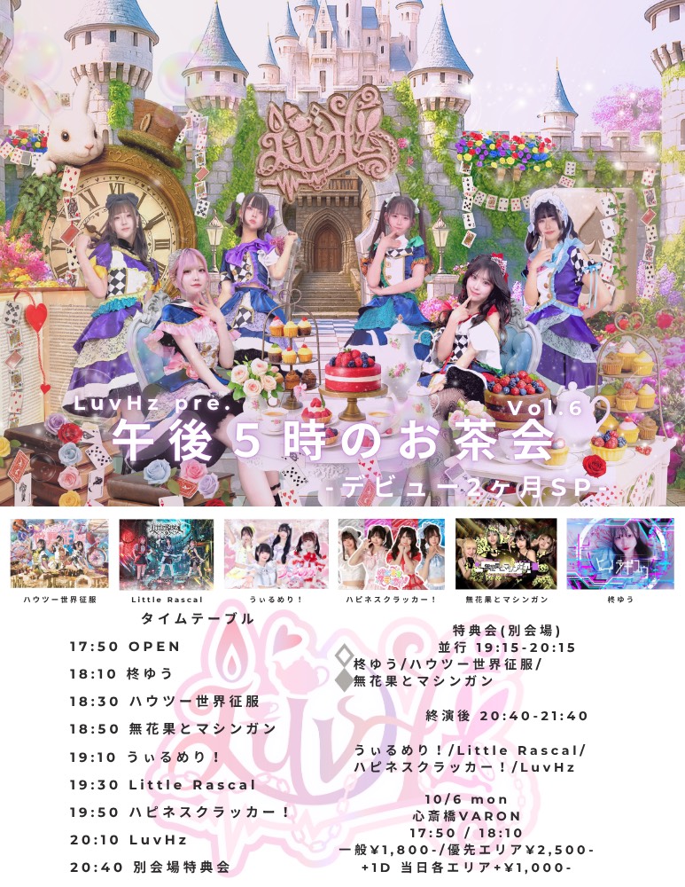心斎橋 VARON(ヴァロン) スケジュール 2025.10.06(Mon) LuvHz pre.午後5時のお茶会 Vol.6 -LuvHzデビュー2ヶ月SP- [ACT] LuvHz / ハウツー世界征服 / Littlle Rascal / うぃるめり! / ハピネスクラッカー! / 柊ゆう / 無花果とマシンガン [OPEN/START] 17:50/18:10 [料金] 一般1800円/優先エリア2500円 (1D別) (問)心斎橋VARON 06-6243-1400 / info@osaka-varon.jp チケットはこちら↓ https://tiget.net/events/433963