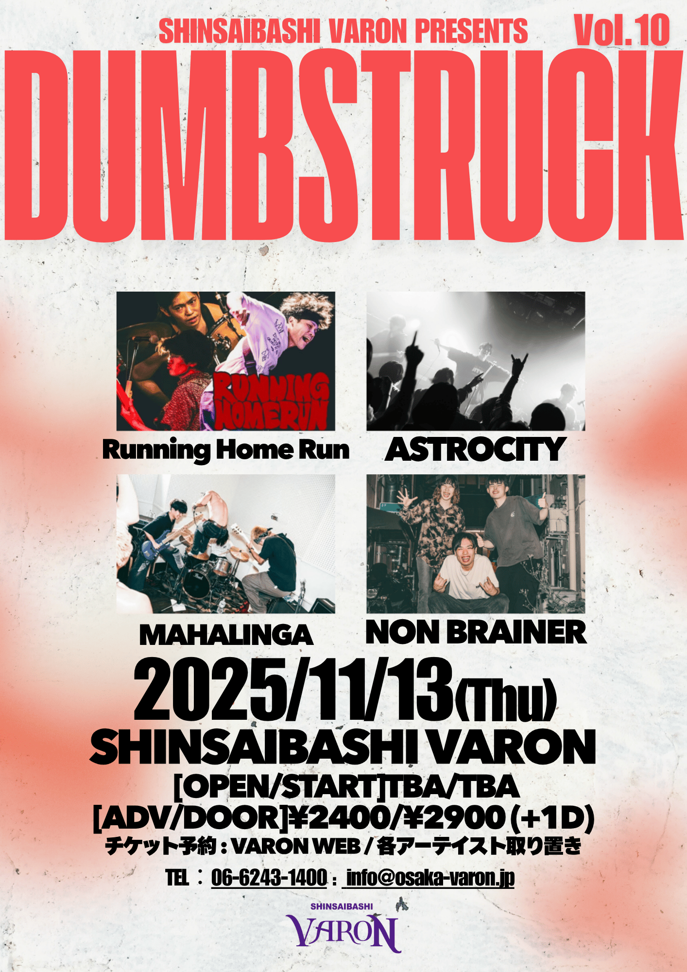 心斎橋 VARON(ヴァロン) スケジュール 2025.11.13(Thu) DUMBSTRUCK Vol.10 [ACT] MAHALINGA / NON BRAINER / Running Home Run / ASTROCITY [OPEN/START] 19:00/19:30 [料金] ¥2400/¥2900 (+1D) (問)心斎橋VARON 06-6243-1400 / info@osaka-varon.jp