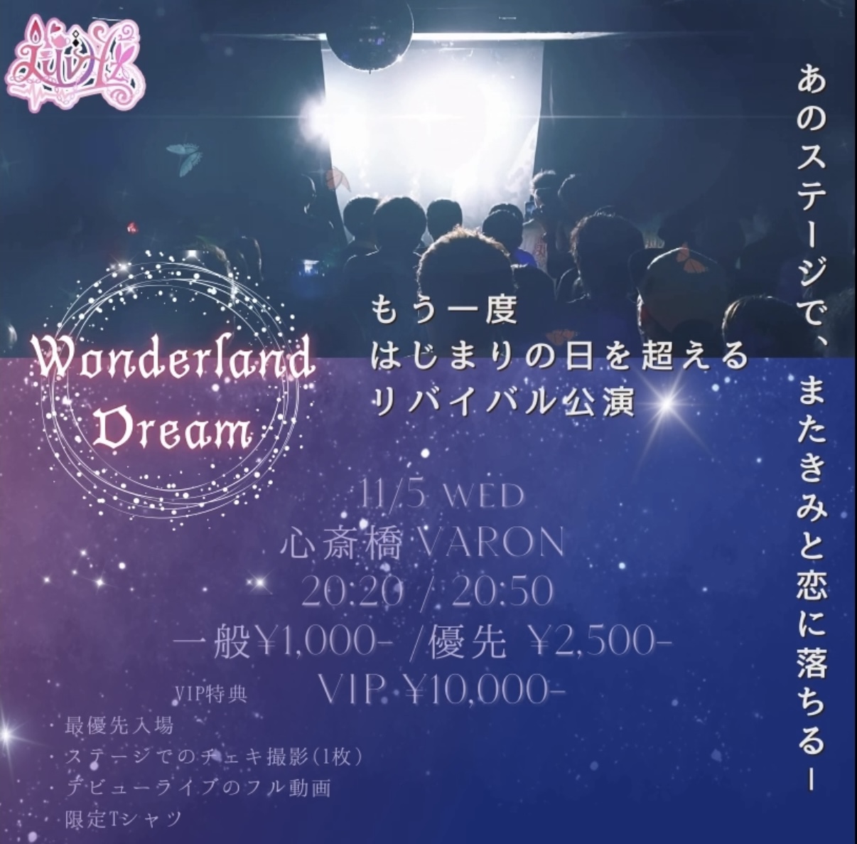 VIPチケット (最優先入場/終演後にステージ上でのチェキ撮影/デビュー公演のMC込み楽屋オフショット付きフル動画/限定Tシャツ)