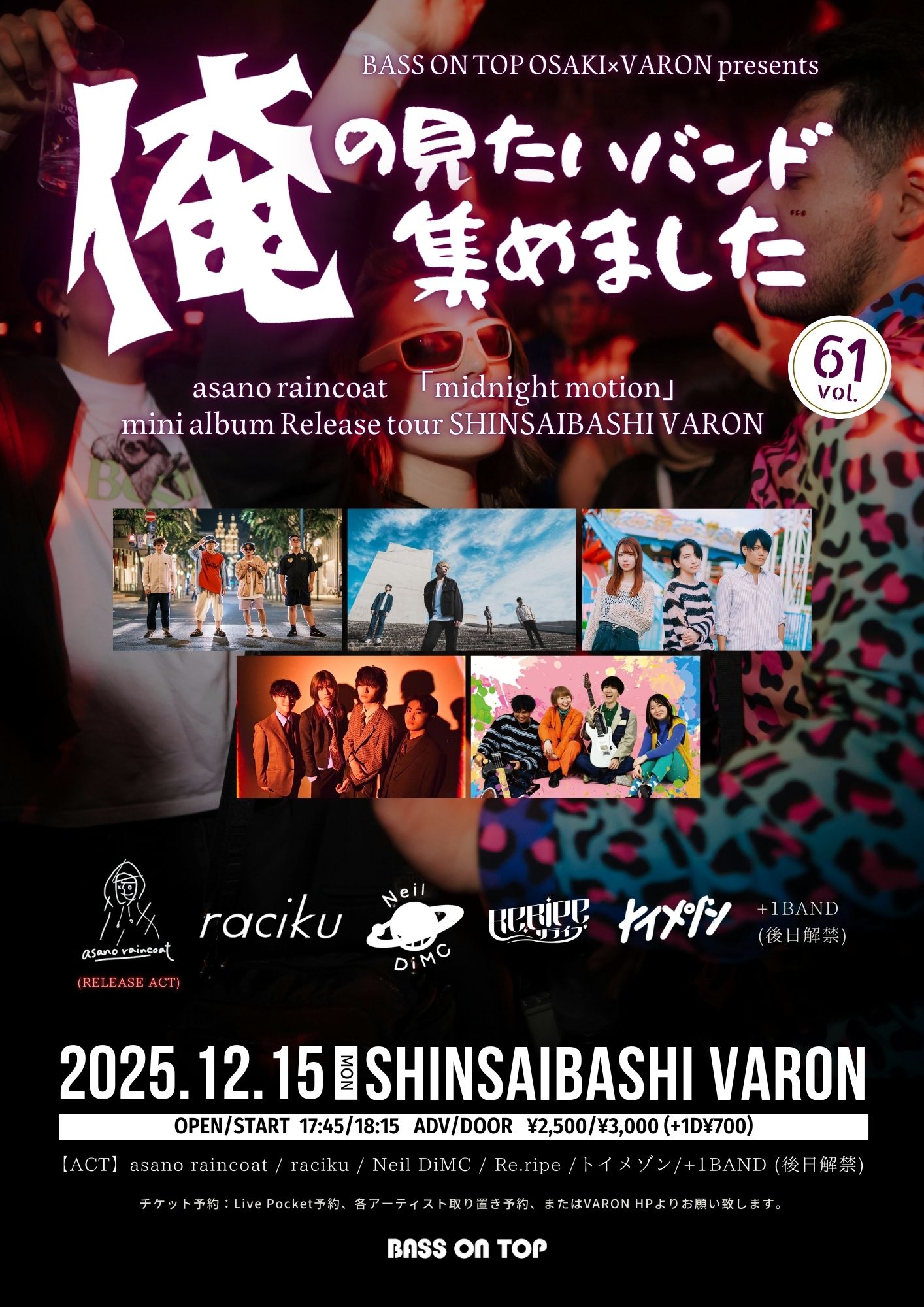 VARON×BASSONTOP OSAKI pre.俺の見たいバンド集めました vol.61 asano raincoat『midnight motion』 mini album Release SHINSAIBASHI VARON