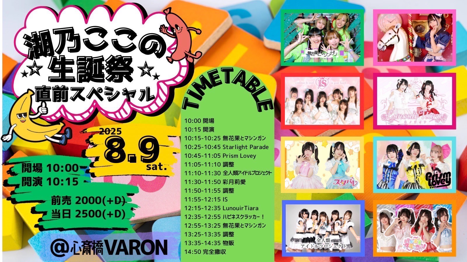 心斎橋 VARON(ヴァロン) スケジュール 2025.8.09(Sat) 湖乃ここの 生誕祭 直前スペシャル [ACT] 彩月莉愛 / LunouirTiara / IS / 全人類アイドルプロジェクト / ハピネスクラッカー!/ PrismLovey / スタパレッ [OPEN/START] 9:30/9:45 [料金] ¥2000/¥2500 ※学生&女性-¥500 (問)心斎橋VARON 06-6243-1400 / info@osaka-varon.jp