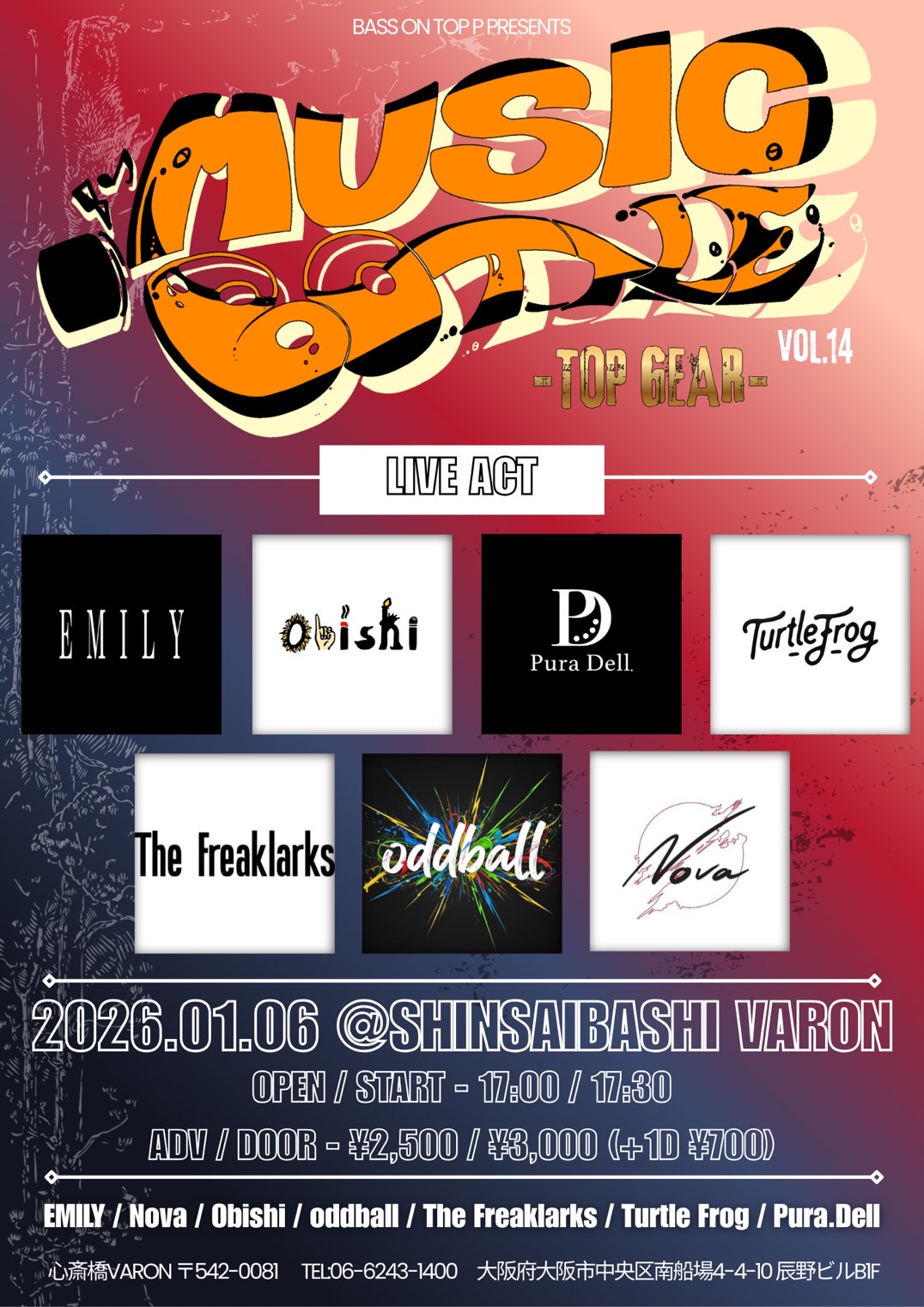 心斎橋 VARON(ヴァロン) スケジュール 2026.1.06(Tue) MUSIC BOTTLE vol.14 -TOP GEAR~ [ACT] EMILY / Nova / Obishi / oddball / The Freaklarks / Turtle Frog / Pura.Dell [OPEN/START] 17:00/17:30 [料金] 【ADV/DOOR】¥2,500 / ¥3,000 (+1D¥700) (問)心斎橋VARON 06-6243-1400 / info@osaka-varon.jp