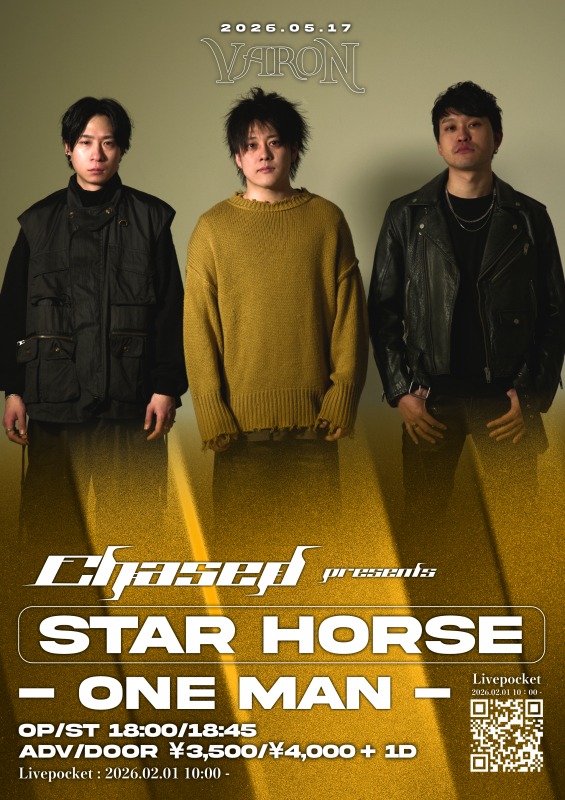 心斎橋 VARON(ヴァロン) スケジュール 2026.5.17(Sun) CHASED pre. [ STAR HORSE - one man - ] [ACT] CHASED [OPEN/START] 18:00/18:45 [料金] ADV/DOOR ¥3,500/¥4,000(1D別) (問)心斎橋VARON 06-6243-1400 / info@osaka-varon.jp チケットはこちらから →https://livepocket.jp/e/j_t7_