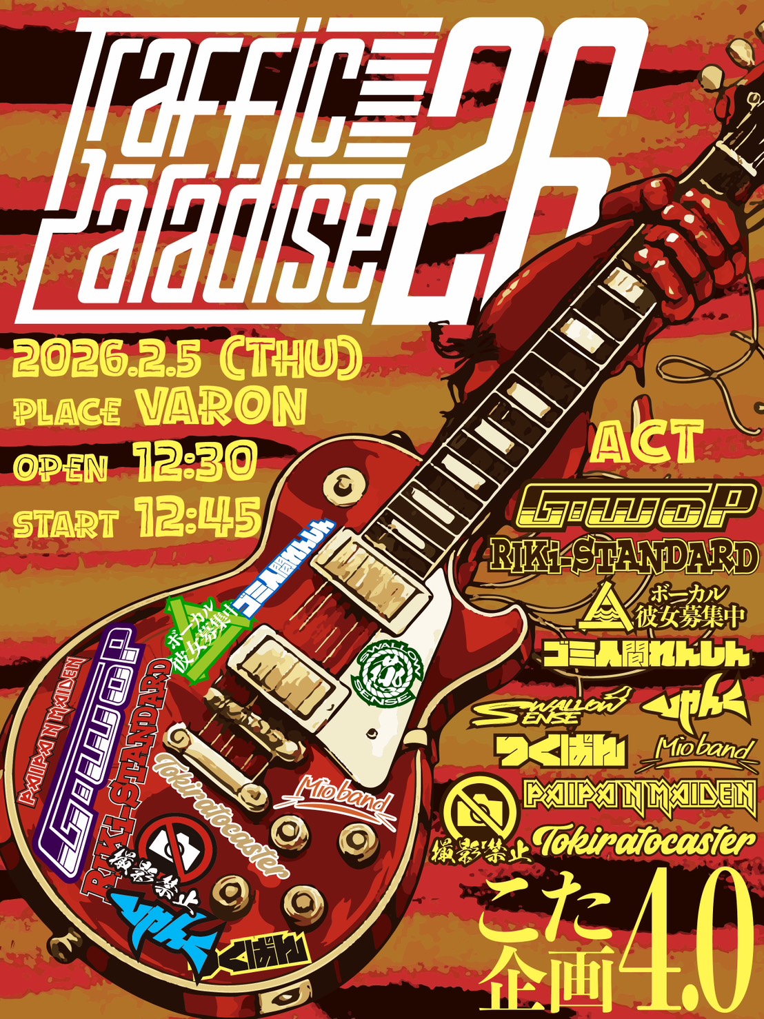 心斎橋 VARON(ヴァロン) スケジュール 2026.2.05(Thu) Traffic Paradise26 こた企画4.0 [ACT] 撮影禁止 / ゴミ人間れんしん / パイパンメイデン / つくぱん / みおバンド / ときらとキャスター / 自慰トーク / ボーカル彼女募集中 / しゃんく / RIKi-STANDARD / G-Wop [OPEN/START] 12:30 / 12:45 [料金] 1D ONLY (問)心斎橋VARON 06-6243-1400 / info@osaka-varon.jp