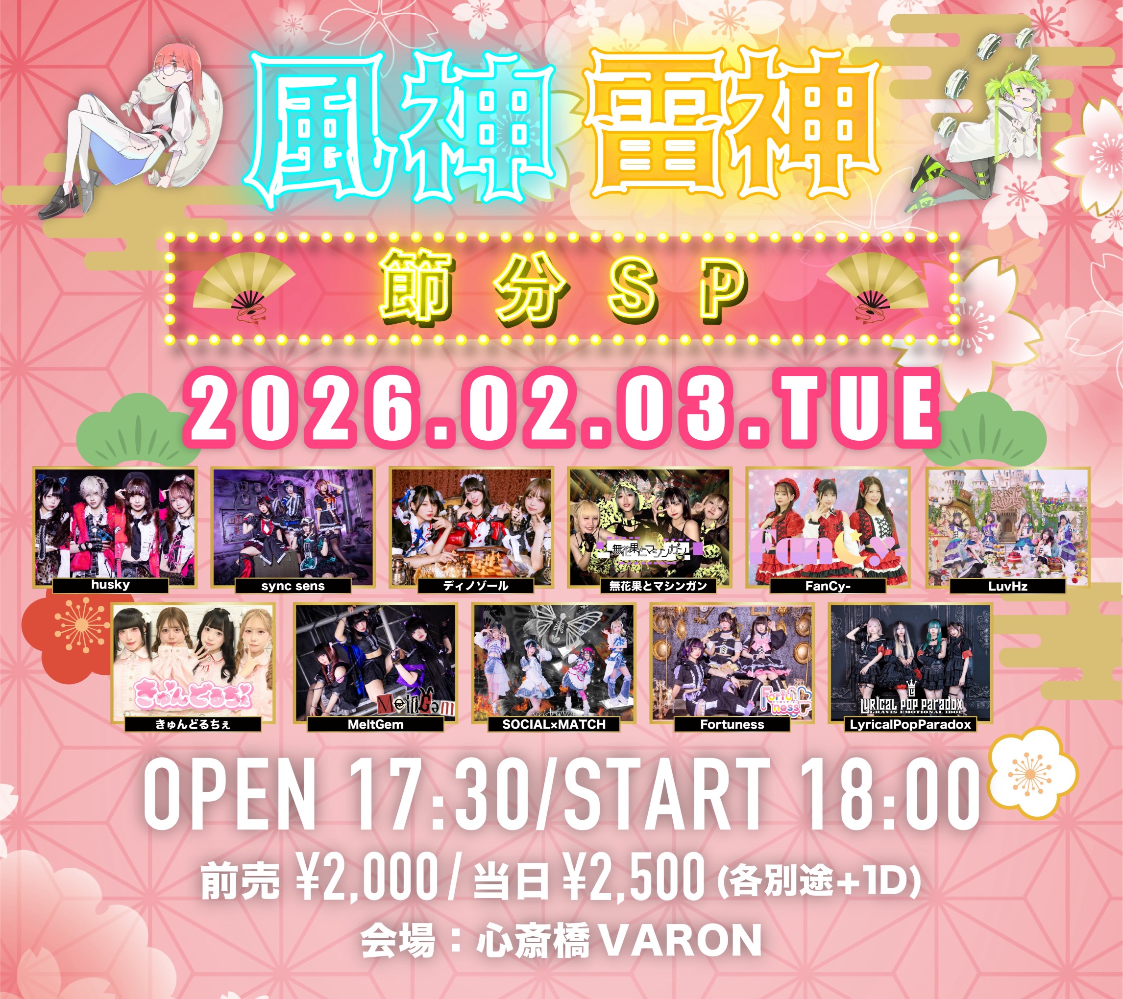 心斎橋 VARON(ヴァロン) スケジュール 2026.2.03(Tue) 風神雷神・節分編 [ACT] husky / sync sens / ディノゾール / 無花果とマシンガン / FanCy- / LuvHz / きゅんどるちぇ / MeltGem / SOCIAL×MATCH / Fortuness / LyricalPopParadox [OPEN/START] 17:30/18:00 [料金] 前売:¥2000 当日:¥2500 (1D別) (問)心斎橋VARON 06-6243-1400 / info@osaka-varon.jp 予約フォーム https://tiget.net/events/461954