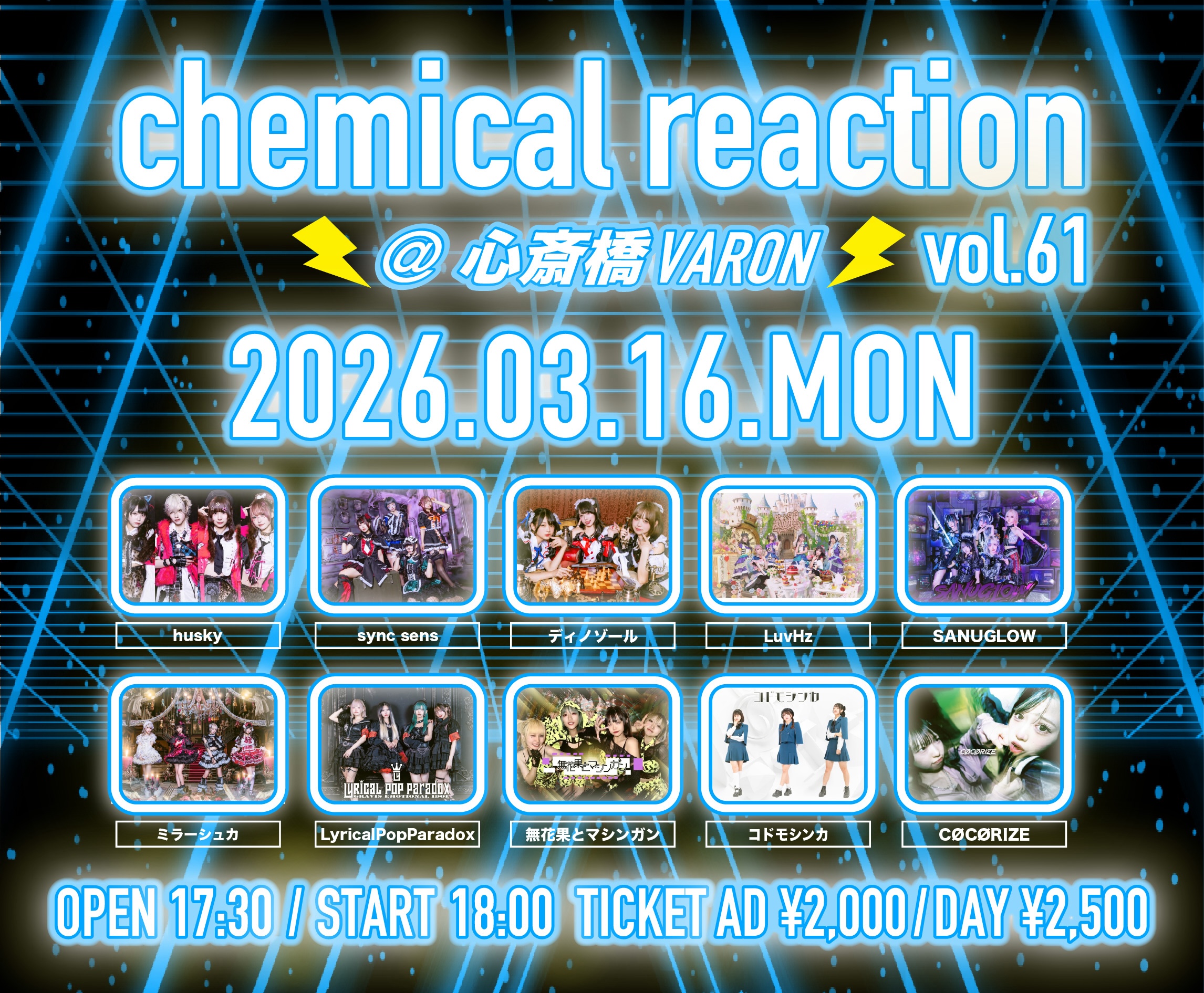 心斎橋 VARON(ヴァロン) スケジュール 2026.3.16(Mon) chemical reaction Vol.61 [ACT] husky / sync sens / ディノゾール / LuvHz / SANUGLOW / ミラーシュカ / LyricalPopParadox / 無花果とマシンガン / コドモシンカ / CØCØRIZE [OPEN/START] 17:30/18:00 [料金] 前売:¥2000 当日:¥2500 (1D別) (問)心斎橋VARON 06-6243-1400 / info@osaka-varon.jp 予約フォーム https://tiget.net/events/469495