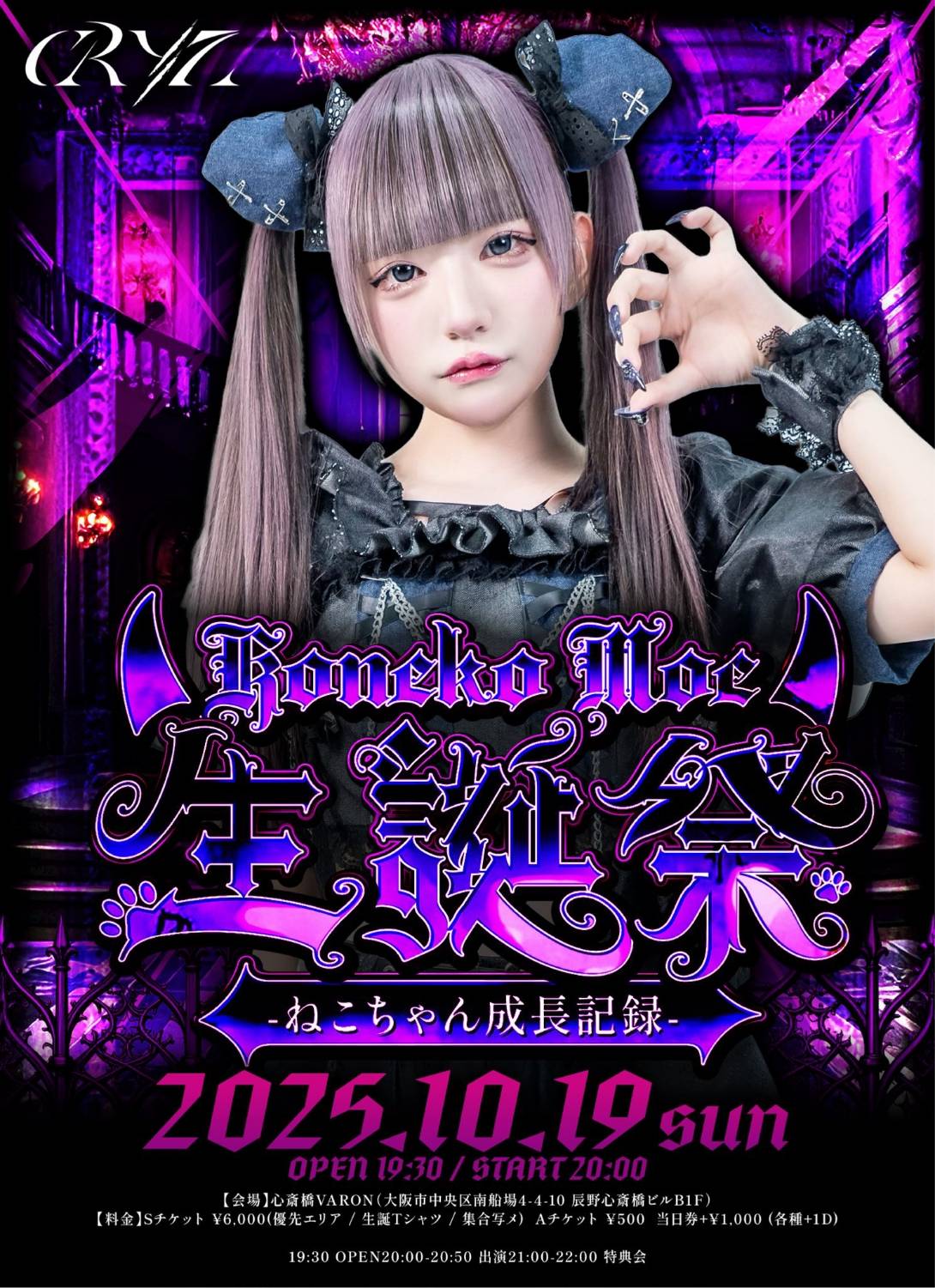 心斎橋 VARON(ヴァロン) スケジュール 2025.10.19(Sun) 虚猫もえ生誕祭-ねこちゃん成長記録- [ACT] CRYZ [OPEN/START] 19:30/20:00 [料金] ・Sチケット:6,000円(前方エリア/限定Tシャツ/集合写メ付き) ・Aチケット:500円 当日券 各+¥1,000 1DRINK代別途必要 (問)心斎橋VARON 06-6243-1400 / info@osaka-varon.jp