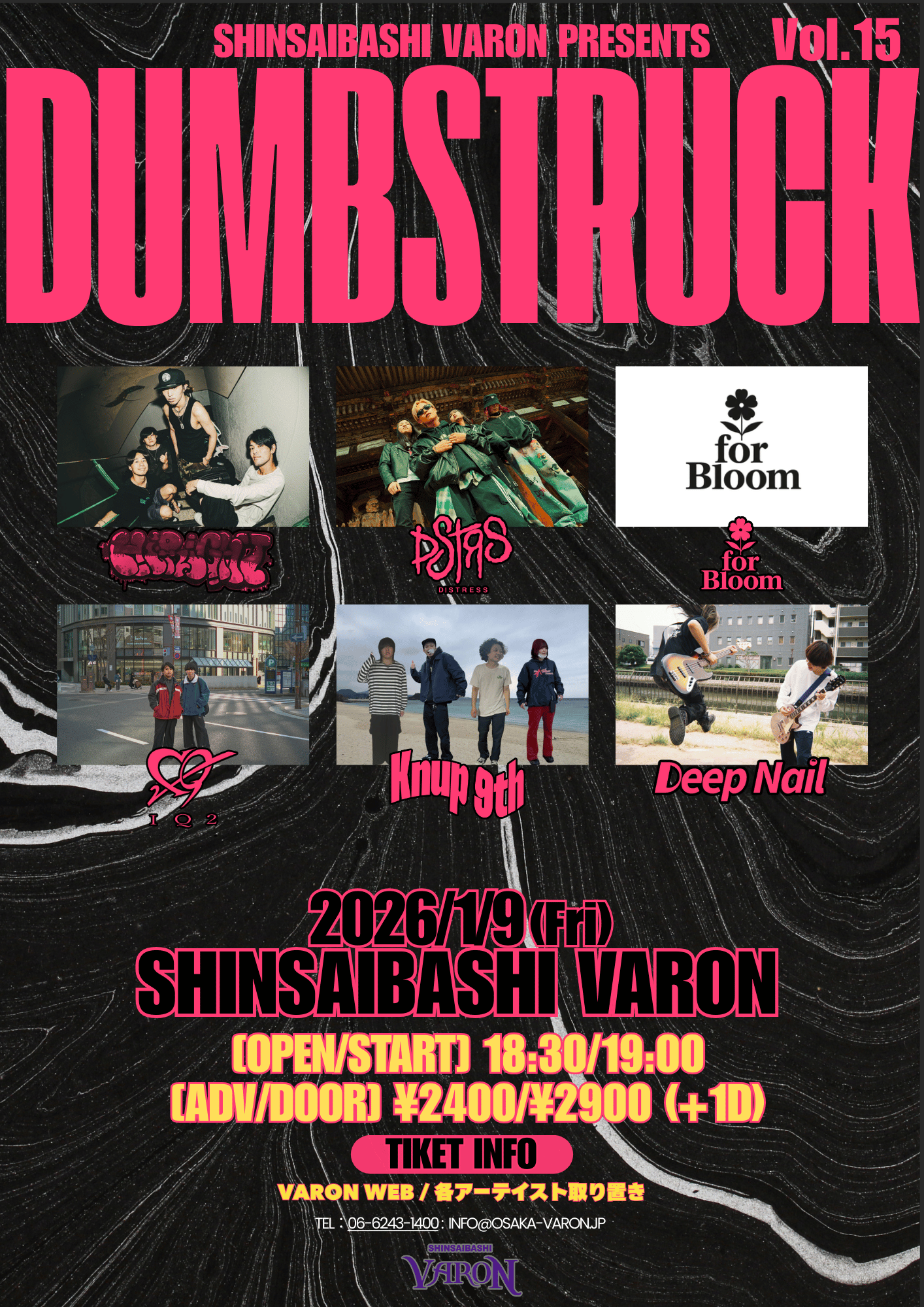 心斎橋 VARON(ヴァロン) スケジュール 2026.1.09(Fri) DUMBSTRUCK Vol.15 [ACT] DISTRESS / Deep Nail / for Bloom. / hi-right / Knup 9th / IQ2 [OPEN/START] 18:30 / 19:00 [料金] ¥2400/¥2900 (+1D) (問)心斎橋VARON 06-6243-1400 / info@osaka-varon.jp