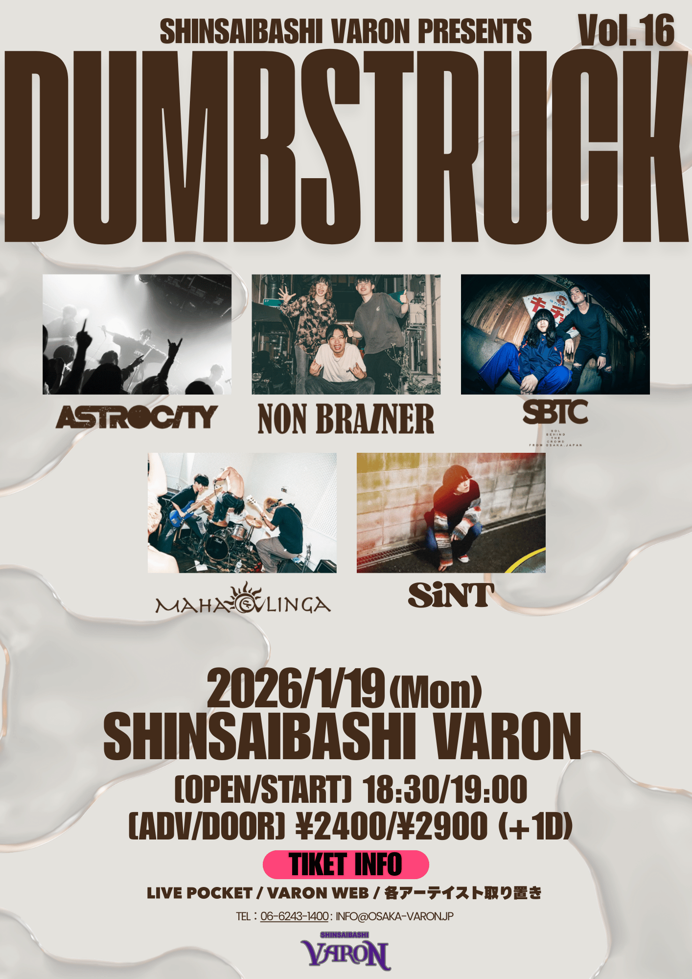心斎橋 VARON(ヴァロン) スケジュール 2026.1.19(Mon) DUMBSTRUCK Vol.16 [ACT] ASTROCITY / NON BRAINER / SiNT / SOL BEHIND THE CROWD / マハーリンガ [OPEN/START] 18:30 / 19:00 [料金] ¥2400/¥2900 (+1D) (問)心斎橋VARON 06-6243-1400 / info@osaka-varon.jp