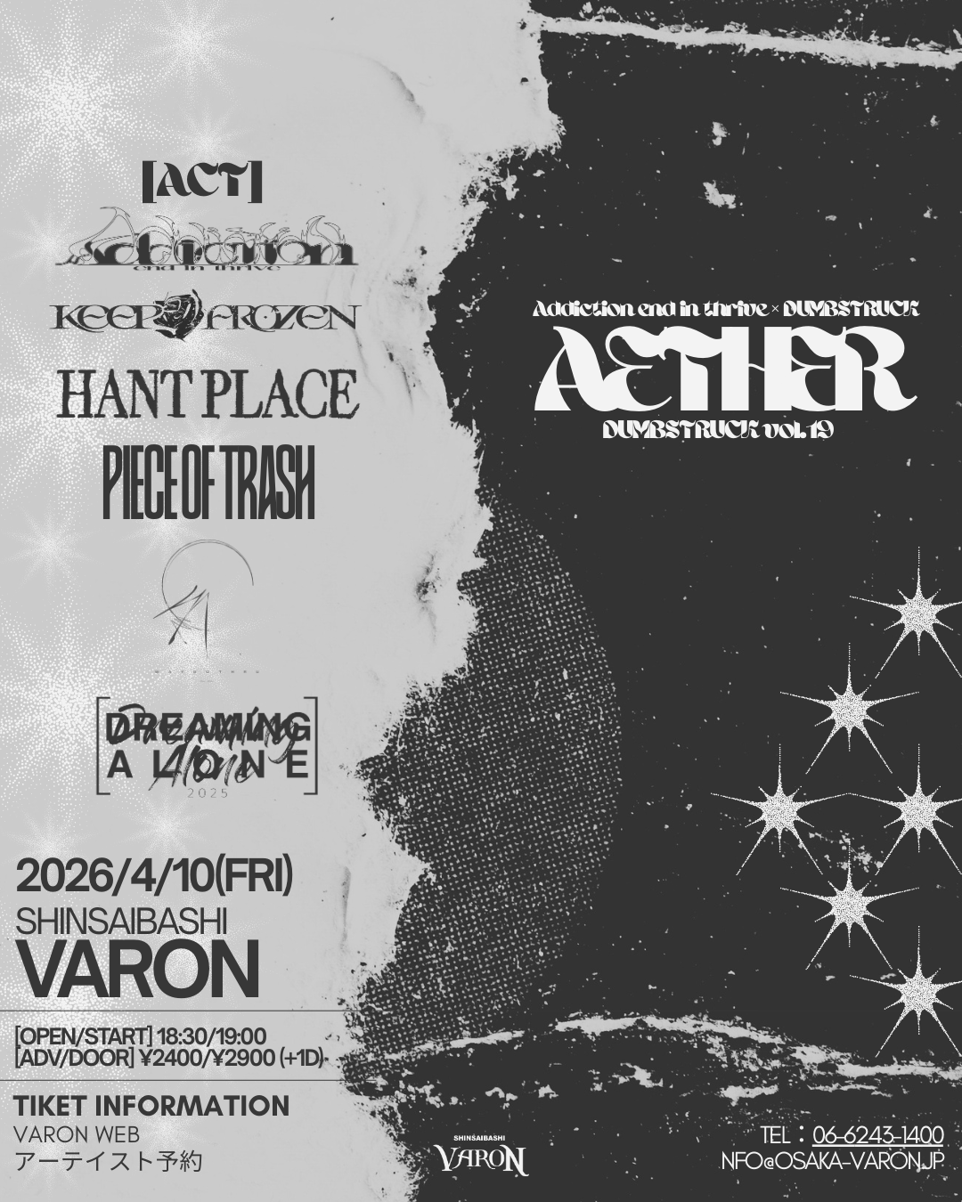 心斎橋 VARON(ヴァロン) スケジュール 2026.4.10(Fri) DUMBSTRUCK vol.19 Addiction end in thrive × DUMBSTRUCK. AETHER [ACT] Addiction end in thrive / KEEP FROZEN / HANT PLACE / DREAMING ALONE / PIECE OF TRASH / WAY DO THRU [OPEN/START] 18:30 / 19:00 [料金] ¥2400/¥2900 (+1D) (問)心斎橋VARON 06-6243-1400 / info@osaka-varon.jp