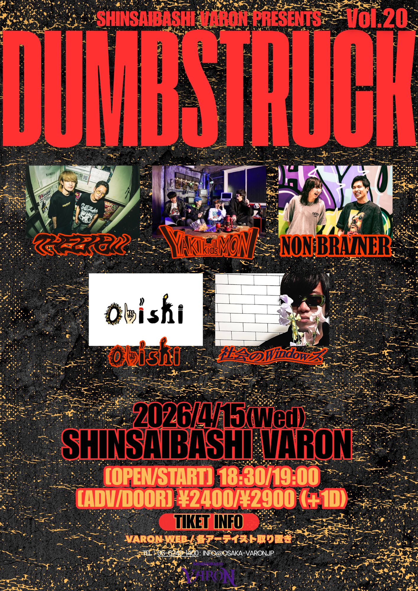 心斎橋 VARON(ヴァロン) スケジュール 2026.4.15(Wed) DUMBSTRUCK Vol.20 [ACT] 社会のウィンドウず / YAKIMON KIDS / The Brew / Obishi / NON BRAINER [OPEN/START] 18:30 / 19:00 [料金] ¥2400/¥2900 (+1D) (問)心斎橋VARON 06-6243-1400 / info@osaka-varon.jp