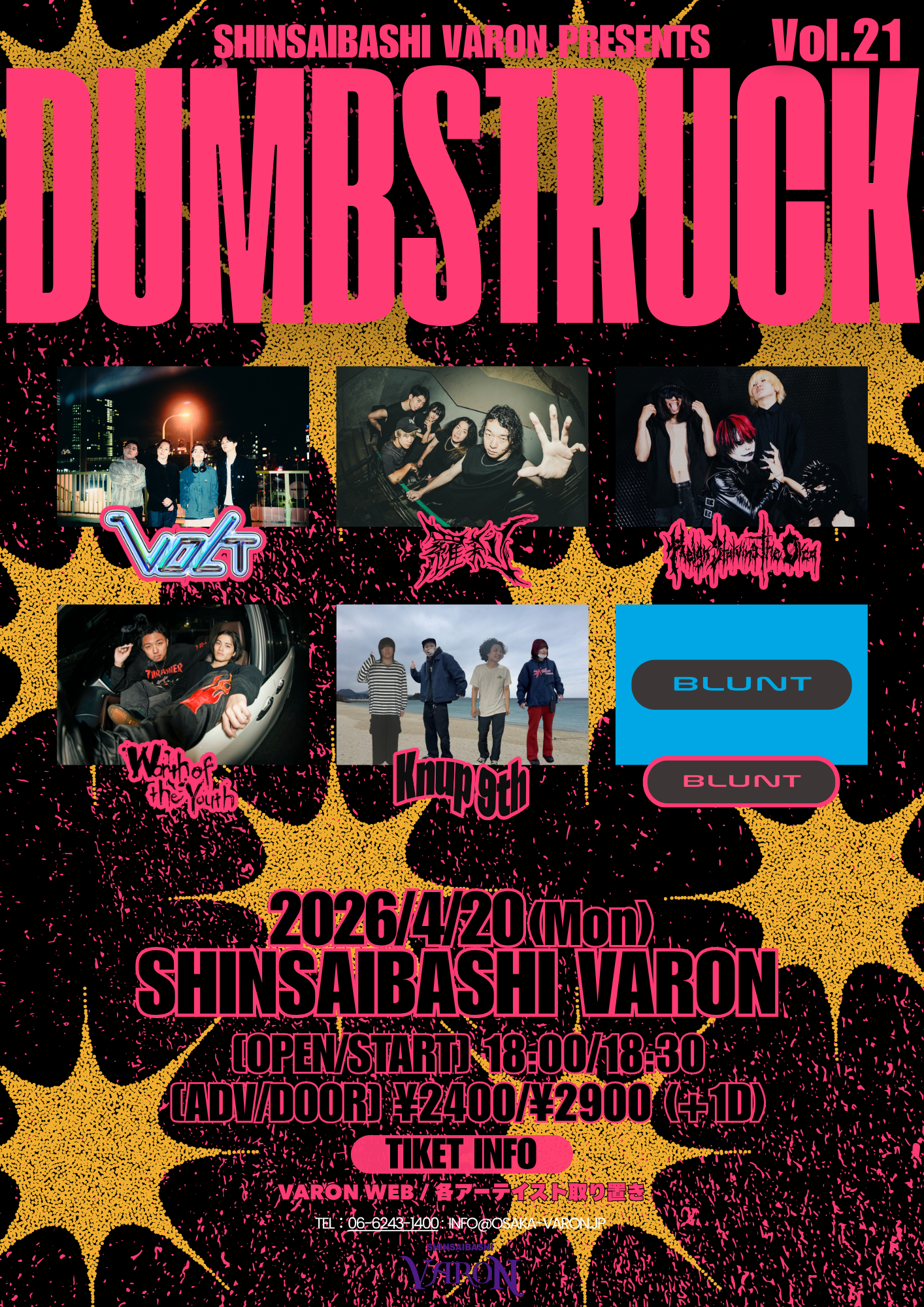 心斎橋 VARON(ヴァロン) スケジュール 2026.4.20(Mon) DUMBSTRUCK Vol.21 [ACT] 羅刹 / Reign Starving the Orca / VOLT / BLUNT / Knup 9th / Worth of the Youth [OPEN/START] 18:00 / 18:30 [料金] ¥2400/¥2900 (+1D) (問)心斎橋VARON 06-6243-1400 / info@osaka-varon.jp