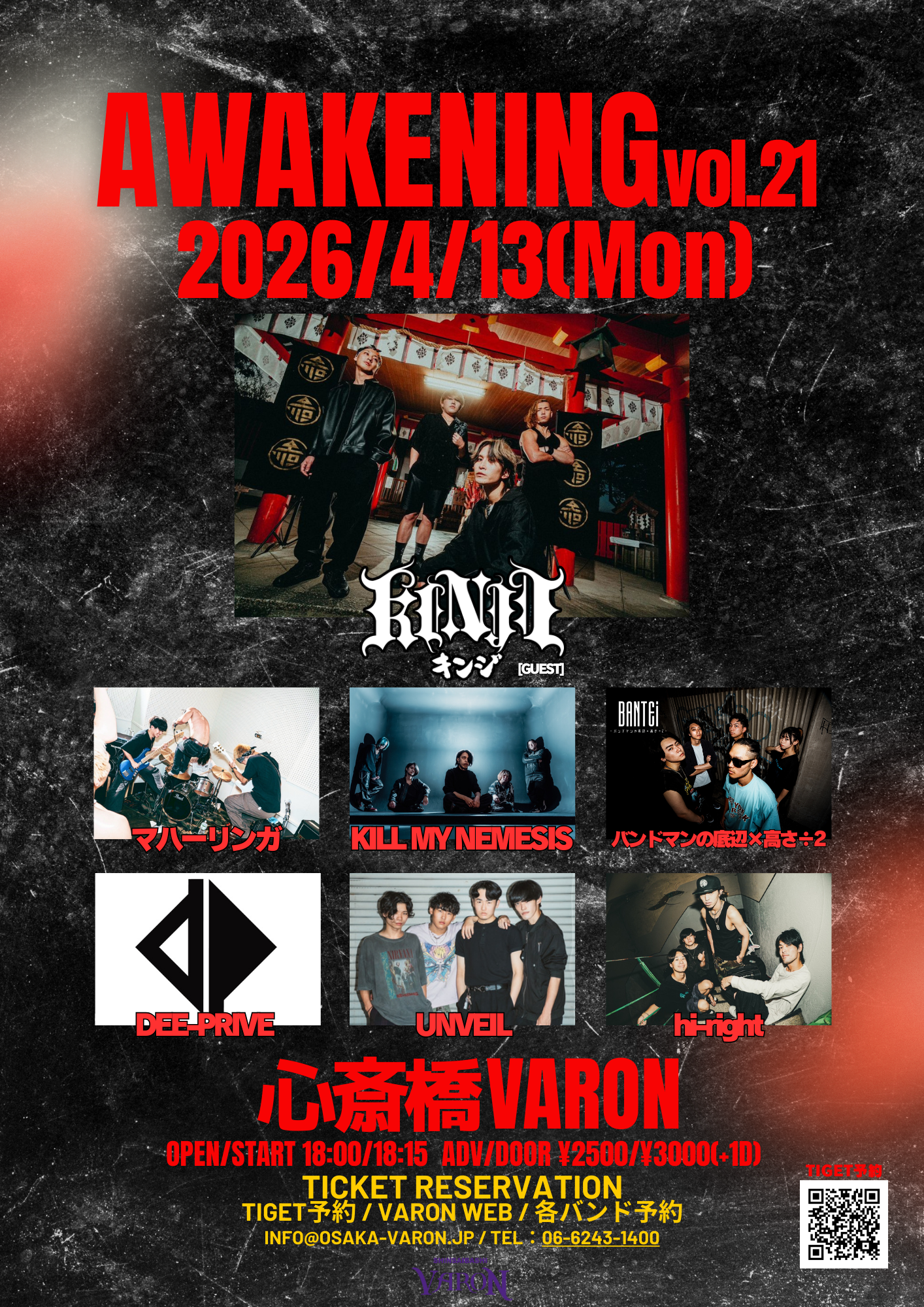 心斎橋 VARON(ヴァロン) スケジュール 2026.4.13(Mon) AWAKENING vol.21 [ACT] KINJI [Guest] / マハーリンガ / UNVEIL / KILL My NEMESIS / Dee-prive / バンドマンの底辺×高さ÷2 / hi-right [OPEN/START] 18:00/18:15 [料金] ADV/DOOR ¥2,500/¥3,000(別途Drink代¥700) (問)心斎橋VARON 06-6243-1400 / info@osaka-varon.jp [チケット] Tiget予約→https://tiget.net/events/462707