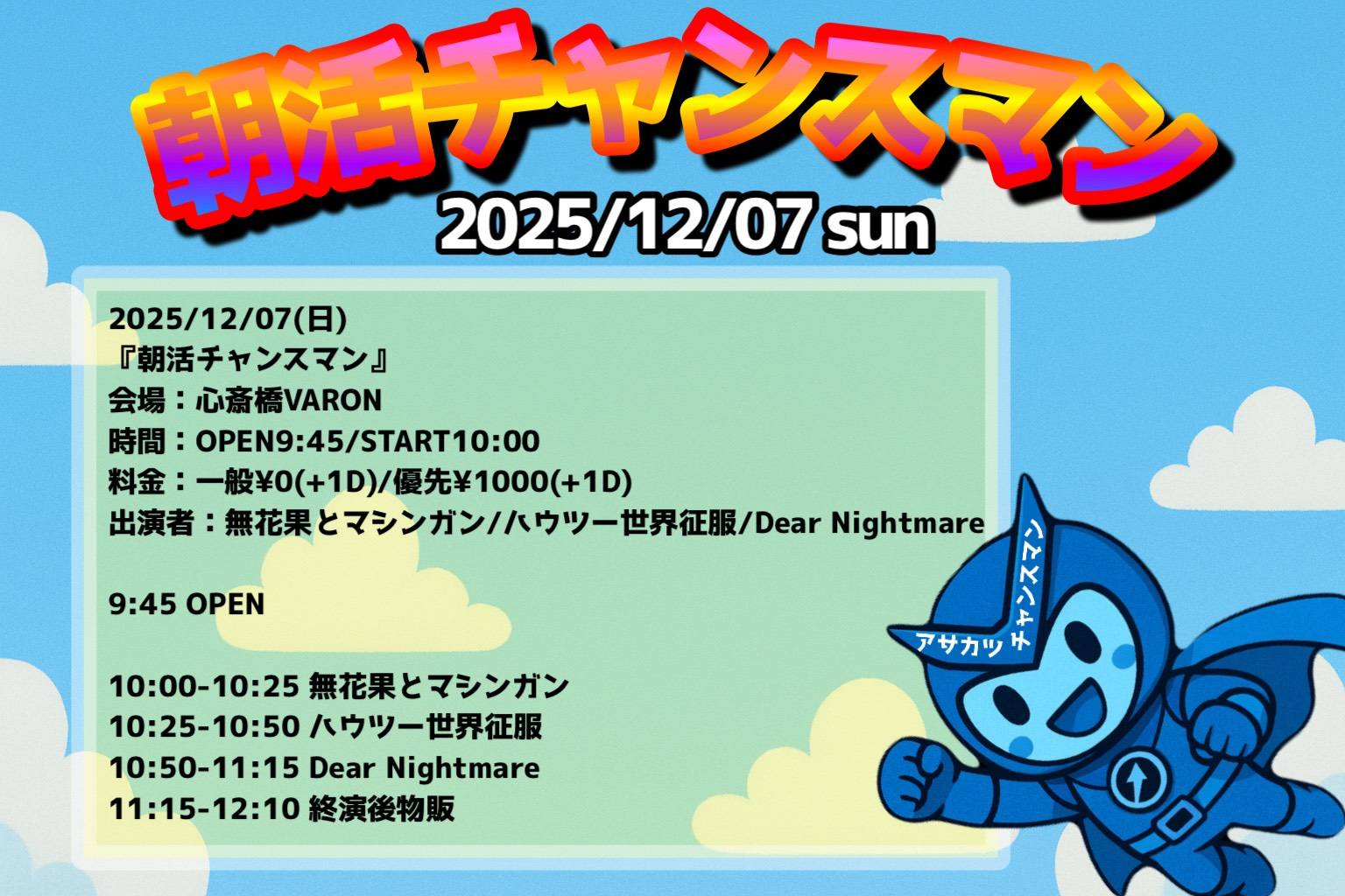 心斎橋 VARON(ヴァロン) スケジュール 2025.12.07(Sun) 『朝活チャンスマン』 [ACT] 無花果とマシンガン / ハウツー世界征服 / Dear Nightmare [OPEN/START] 9:45/10:00 [料金] 一般¥0(+1D) / 優先¥1000(+1D) (問)心斎橋VARON 06-6243-1400 / info@osaka-varon.jp 予約 https://tiget.net/events/449797