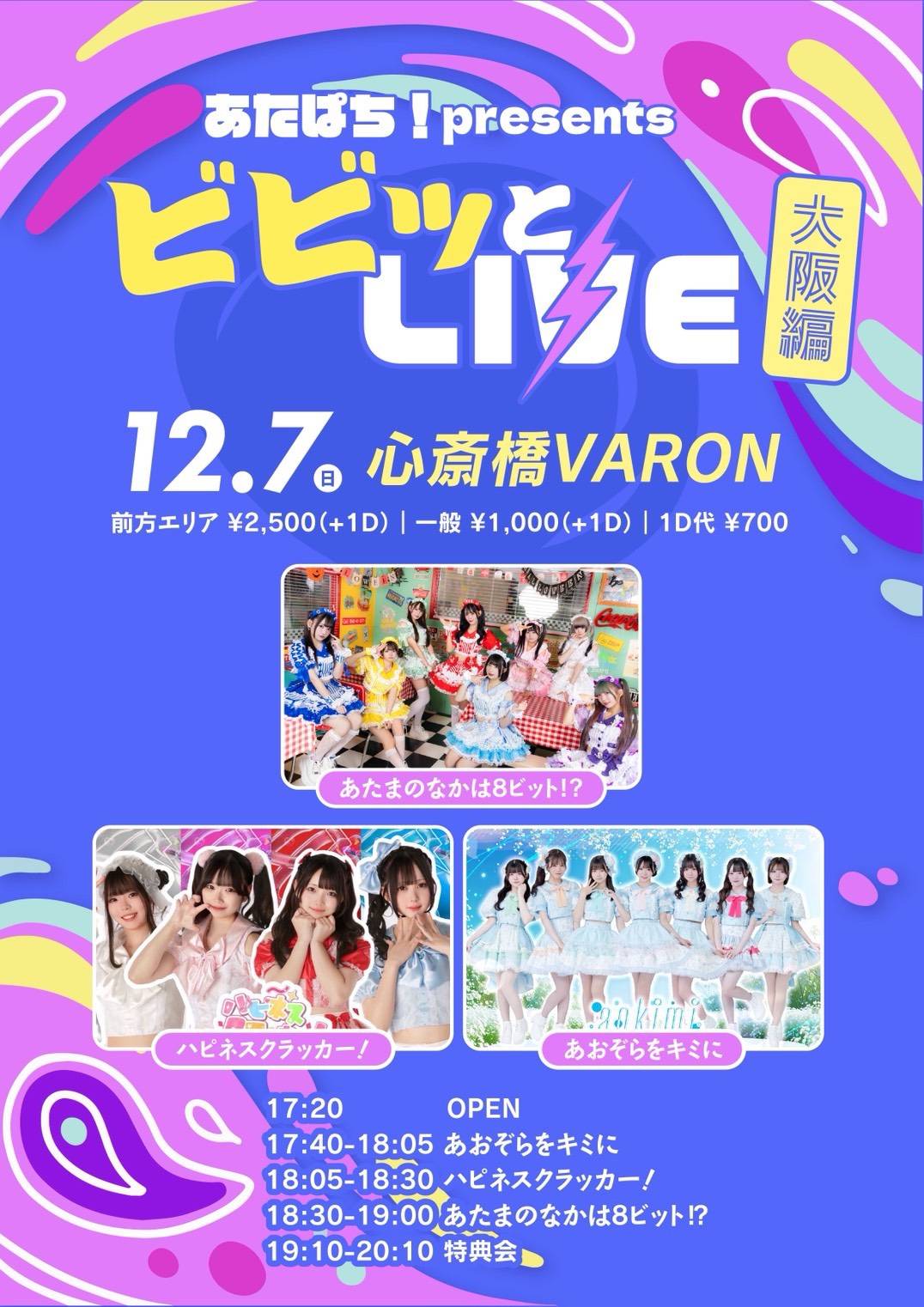 心斎橋 VARON(ヴァロン) スケジュール 2025.12.07(Sun) あたぱち!presents ビビッとLiVE 大阪編 [ACT] あたまのなかは8ビット⁉ / ハピネスクラッカー! / あおぞらをキミに [OPEN/START] 17:20/17:40 [料金] 前方エリア¥2,500+(1D代) / 一般¥1,000+(1D代) (問)心斎橋VARON 06-6243-1400 / info@osaka-varon.jp チケット https://t-dv.com/btlive-1207