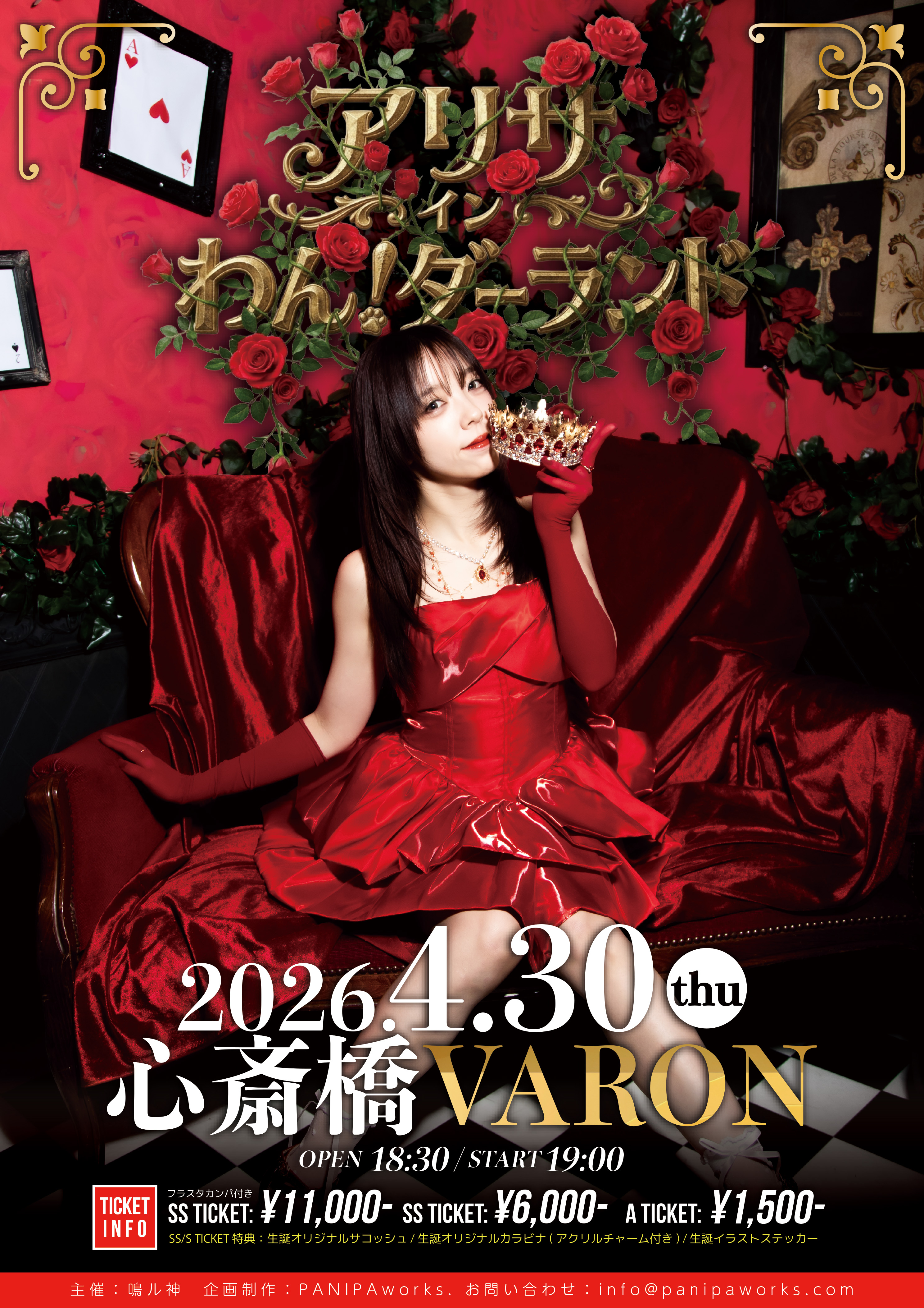 - SSチケット ¥11,000 / Sチケット ¥6,000 / Aチケット ¥1,500 (入場の際、別途ドリンク代必要)