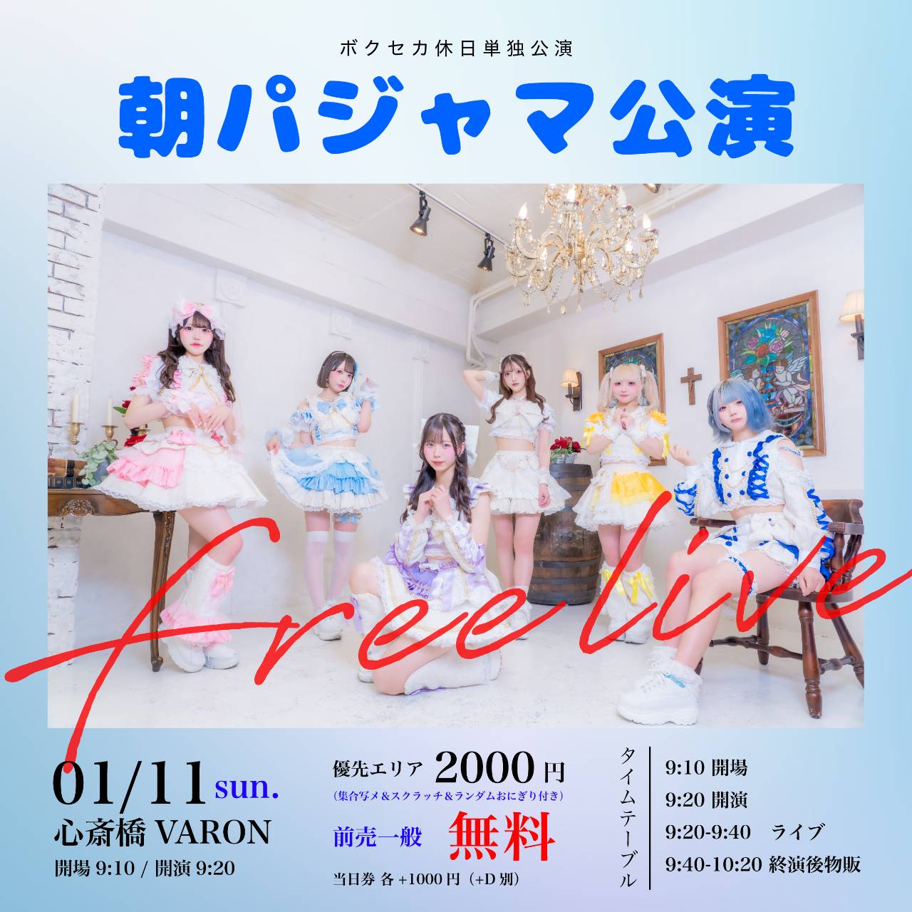 心斎橋 VARON(ヴァロン) スケジュール 2026.1.11(Sun) ボクセカ休日単独公演 -朝パジャマ公演- [ACT] ボクセカ [OPEN/START] 9:10/9:20 [料金] ①優先エリア(集合写メ/スクラッチ/ランダムおにぎり) 2000円 / ②一般 0円 / ③当日券 各+1000円 (各+1D別) (問)心斎橋VARON 06-6243-1400 / info@osaka-varon.jp ■ チケットURL:https://t-dv.com/bksk111pajama