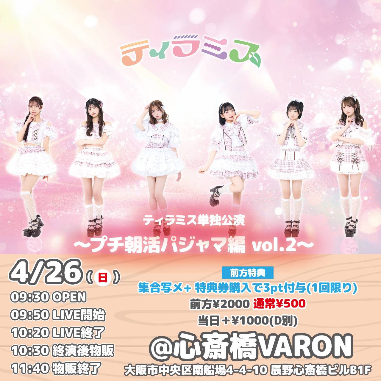心斎橋 VARON(ヴァロン) スケジュール 2026.4.26(Sun) 『ティラミス単独公演〜プチ朝活パジャマ編 vol.2〜』 [ACT] ティラミス [OPEN/START] 9:30/9:50 [料金] 前方2000円 通常500円 当日+1000円(D別) (問)心斎橋VARON 06-6243-1400 / info@osaka-varon.jp 【チケットURL】 https://t-dv.com/tiramis_asa0426